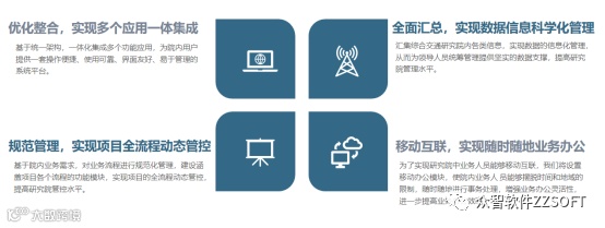 基于统一架构,一体化集成客户资源管理、项目跟踪、项目生产、产值管理、业绩库、终止项目库、数字化出版管理、项目总承包、档案管理、知识库管理、财务管理、项目群管理、运维管理、移动办公、人力资源管理、综合办公等多个功能应用,为院内用户提供一套操作便捷、使用可靠、界面友好、易于管理的系统平台。