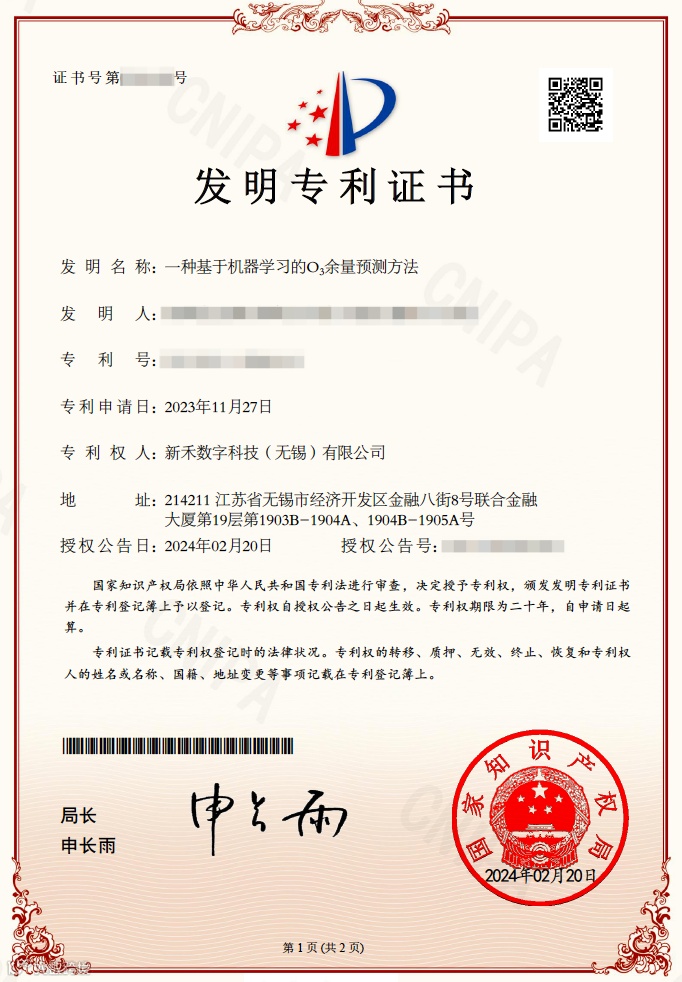 近日,新禾数科在大气环境科技智能化创新领域再创佳绩,成功获得了由国家知识产权局正式颁发的发明专利证书,发明专利名称为“一种基于机器学习的O3余量预测方法”,这一里程碑式的突破标志着新禾在臭氧等大气污染物预测等技术领域取得了创新性进展。