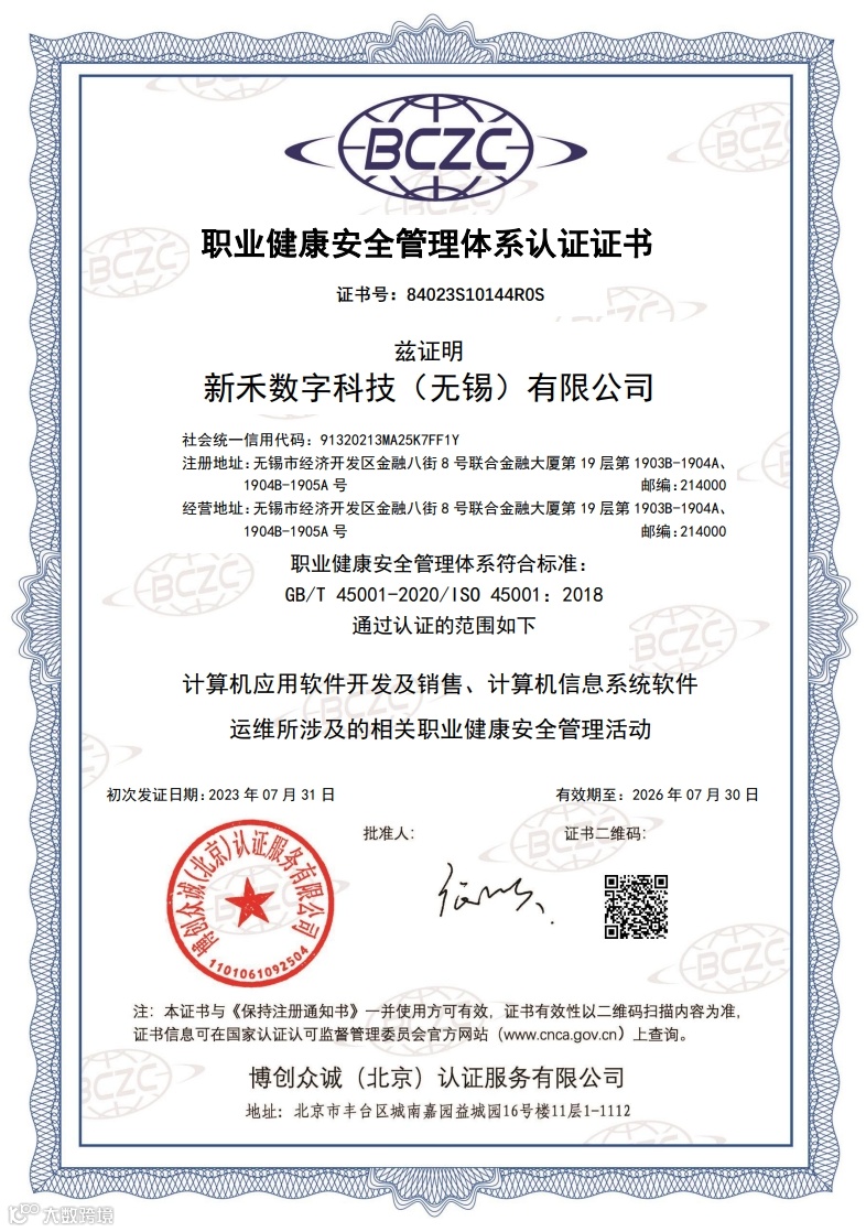 近日,经国家权威机构认证与审核,新禾数字科技(无锡)有限公司(简称“新禾”)顺利通过ISO“三体系”(ISO9001质量管理体系、ISO14001环境管理体系、ISO45001职业健康安全管理体系)认证,标志着新禾在精细化、制度化、规范化管理方面迈上了新台阶。
