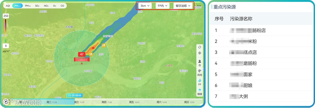 在实际应用中,通过平台地图报警点定位可视化分析功能,用户可以精准筛选站点周边1~5km范围内的污染源信息,结合溯源模型,锁定疑似污染来源企业和点位,生成重点污染源管控清单,协助环保部门更加有效地制定相关管控计划,开展现场排查和治理工作。