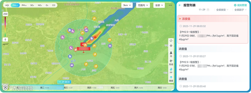 当用户选中报警列表中的某条报警信息时,地图时间轴会自动切换至该报警时刻,并将视角定位至该报警站点,开启该时刻的空气质量插值和溯源模型结果显示。同时,高值分析模块也会对应显示报警当天或对应时刻的可视化图表,例如:传输分析、来源分析、溯源分析、特征雷达、多因子相关性等等,帮助用户更直观地分析污染成因,做出科学研判。