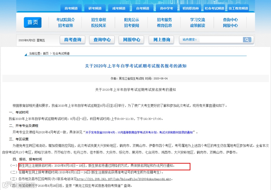 (二)在籍考生网上报考课程时间:2020年6月11日—24日(新生注册报名获得准考证号的考生即为在籍考生)。