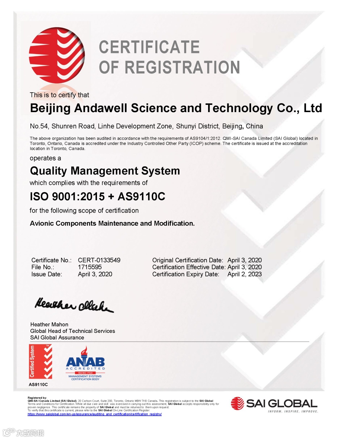 AS9110质量标准是国际航 空航天质量组织(IAQG)对航空维修企业质量体系所制订的权威标准,以ISO9001:2015标准为基础,附加近100项针对航天航空维护修理和检修行业的质量管理标准,包括了航线维护、定检大修、技术改装、附件维修、机队管理、工程服务和航材管理服务在内的多项航空维修服务业务的国际质量标准。
