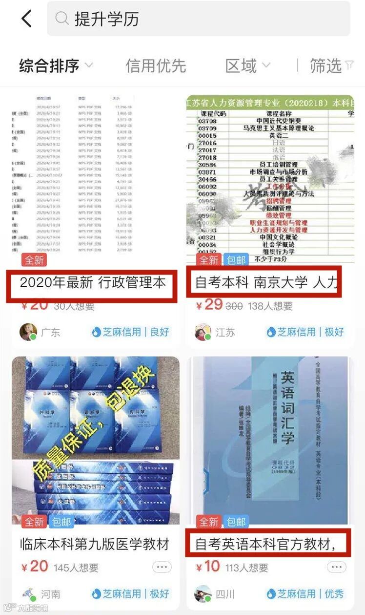在国内某家的交易平台上,搜索“提升学历”,大部分出现的商品都是跟考试有关的教材。