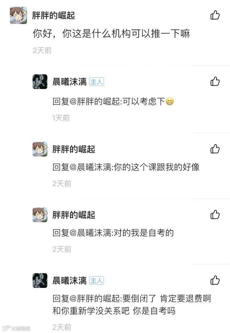 我注意到一位网友,在留言中咨询是什么机构的课程,原来是自己报考培训的那家机构倒闭了,所以无奈想再买一些自考学习资料。