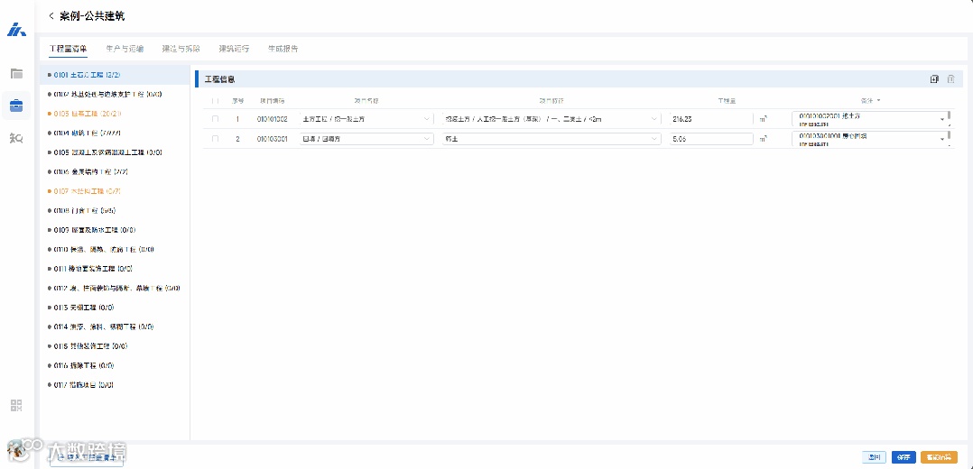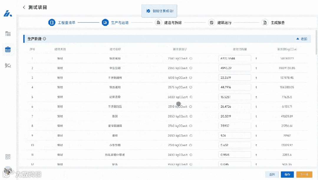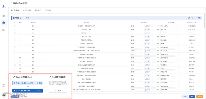 ● 2023年1月推出“基于工程量清单的碳计算”模块。作为碳排放计算工具的核心模块之一,它内置了国家工程量定额标准,用户只需上传项目的工程量清单,工具便能自动进行读取、筛选、匹配等一系列解析,一键生成建筑生产、运输、建造和拆除四大阶段的碳排放量。
