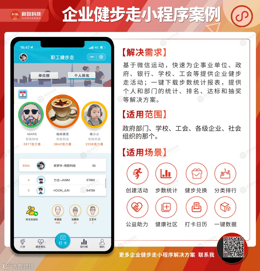 基于微信运动,快速为企事业单位、政府、银行、学校、工会等提供企业健步走活动;一键下载步数统计报表,提供个人和部门的统计、排名、达标和抽奖等解决方案。