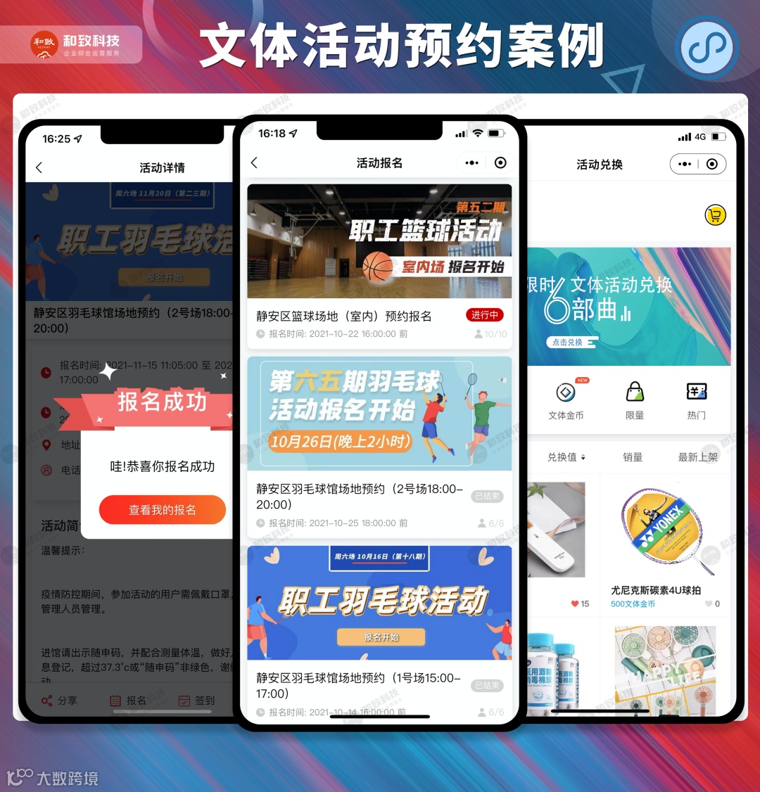 活动创建、活动分类、列表展示、预约详情、签到签退、积分系统、报名管理、一键分享、短信通知等。