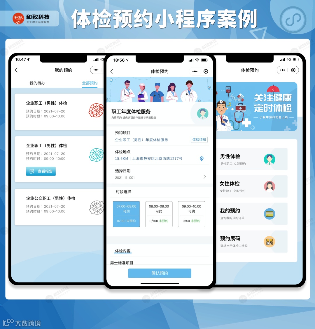 体检类目管理、预约时间管理、导航地图、健康码展示、预约进度查询、信息登记、短短信通知等。