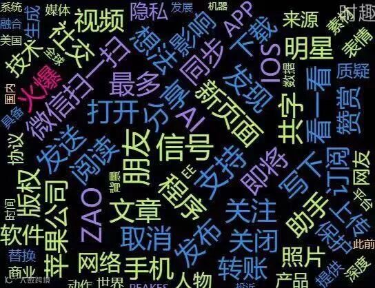 从“分享”、“社交”、“朋友”、“影响”等这些提及的微信内容高频词也可看出,ZAO的背后正是陌陌私人社交的一次尝试,产品设计中依托微信、微博、QQ等社交分享功能,融入有趣好玩的追星元素,让用户尽可能分享到社交平台,撩拨着用户的猎奇心理与传播欲望,进一步扩充社交关系网络。