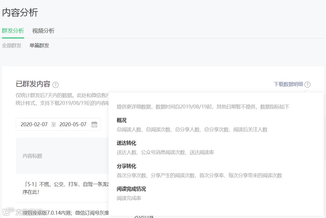 5月7日,公众号后台支持批量导出已群发内容的详细数据。用户可登陆mp,进入“统计-内容分析-单篇群发-下载数据明细”,目前最早可选择时间为2019年8月19日,用户可以选择时间跨度不超过3个月的数据进行下载,详细数据包括阅读数、分享数、送达转化数、分享转化数、阅读完成率等。