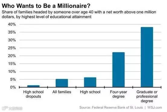美联储St.Louis 分部的统计数据,说明了家庭中受教育程度最高者(需大于40岁)的受教育程度与家庭净财富超过100万美元的比例的关系。可见绝对财富的级差比收入级差触目惊心多了。硕士学历以上家庭比高中学历家庭的百万富翁比例高30倍。