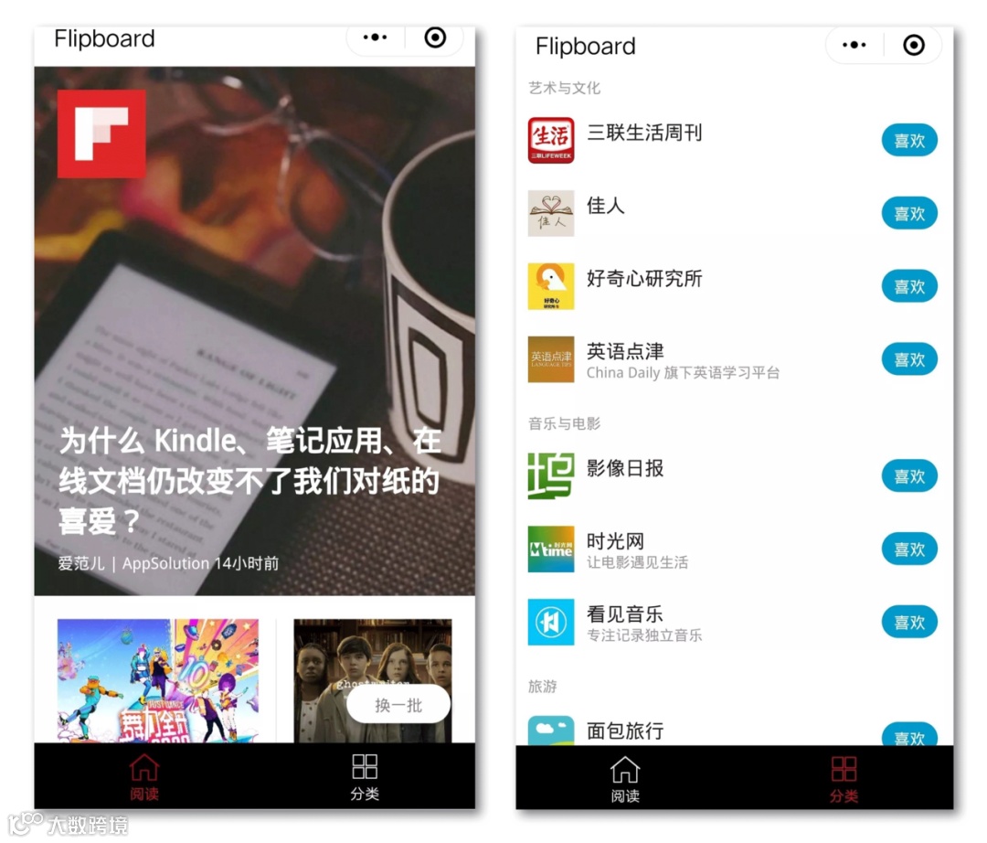 这款小程序分为两个栏目:“阅读”和“分类”。“阅读”栏目会每天更新新闻、商业、旅游、设计与美图、体育与健身等覆盖10个不同领域的丰富的资讯内容,并配以精美的图片。同时还在界面的右下角设置了“换一换”功能,帮助用户从海量的内容当中筛选出自己感兴趣的文章。