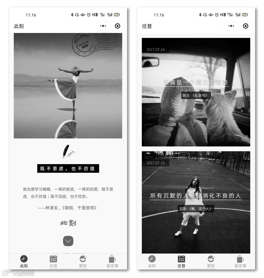 优点:每天都会推送一张图片,一段美文,意境深刻。通过「定格此刻」,即可输出一张供收藏亦或转发的精美明信片。