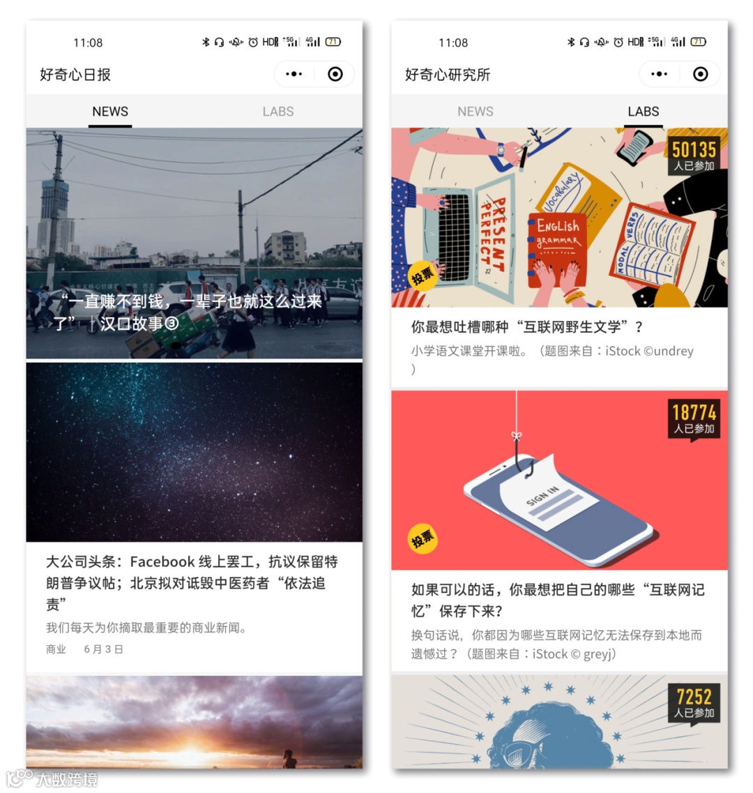 “NEWS”即“好奇心日报”,其收录文章包括文化、商业、生活、时尚等多个主题,每篇文章的最后还提供了相关的延伸阅读链接,方便读者获取更多的相关内容进行深度阅读;“LABS”即“好奇心研究所”,用户可参与话题投票表态,参与投票后还可实时查看别人的态度以及阅读别人的评论。