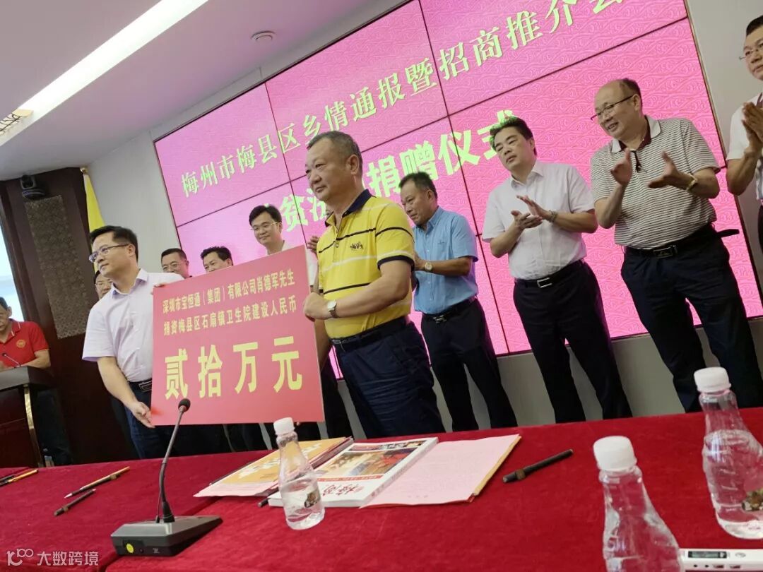近日,梅县区召开乡情通报暨招商推介会,举行梅县区政府与相关企业投资签约和捐赠仪式。中共梅县区委书记钟光灵、区政协主席罗时亮、区委副书记陈远洋、区委常委、办公室主任丘孝良、区委常委、副区长肖天峻、区人民政府副区长、雁洋镇党委书记王宏基等区、镇领导参加会议及八十多位会员企业家和相关领导、及捐赠单位负责人参加了捐赠仪式,一起共商家乡发展大计,共绘美丽家乡蓝图。