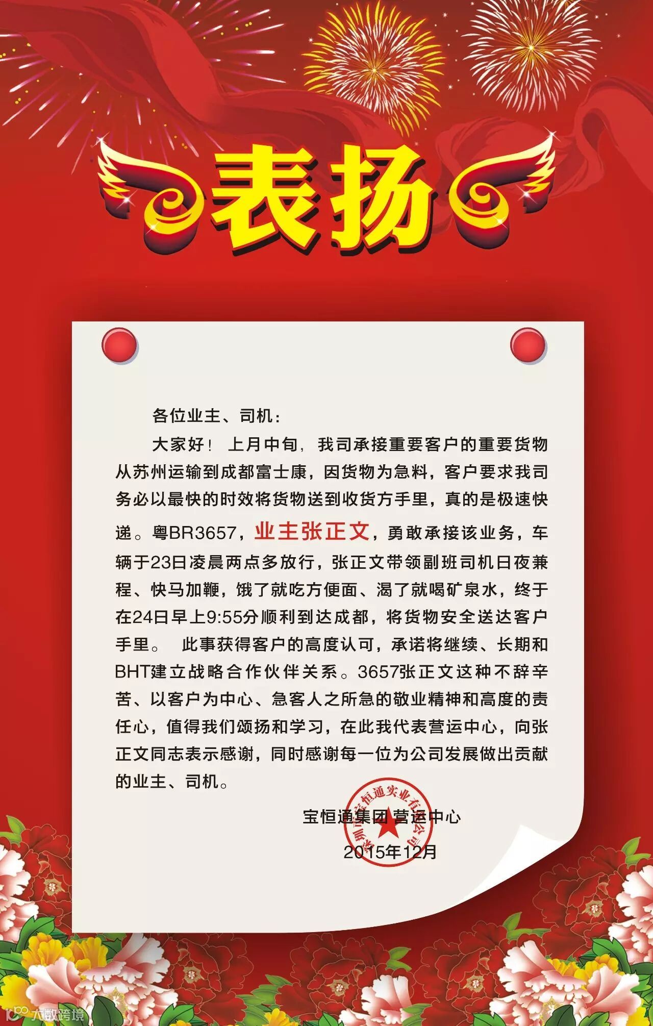 12月中旬,宝恒通集团旗下宝恒通实业有限公司接到重要客户一批重要订单,需超出行业标准时效送达目的地,时间紧,任务急!当大家都说“这么短的时间,肯定完不成这个任务!”,这时候业主张正文挺身而出,不畏困难险阻接下任务,在客户指定时效内出色完成了此任务,表现出了极高的专业水准。正是因为有张正文这样艰苦奋斗、不畏困难的敬业好员工,才能赢得客户的满意,公司才得以茁壮成长,高速发展。为此公司给予其1000元现金奖励表示由衷的感谢。同时,号召集团上下所有员工向他学习!