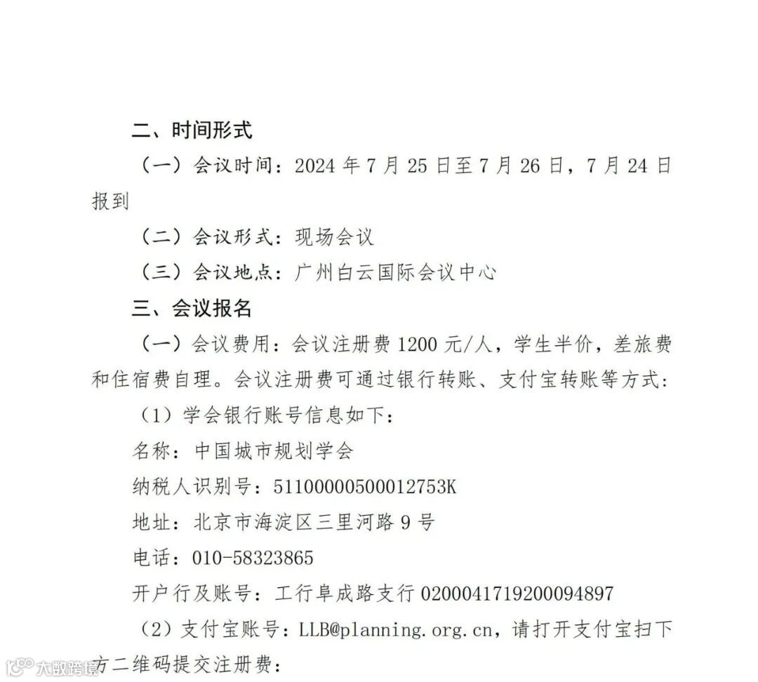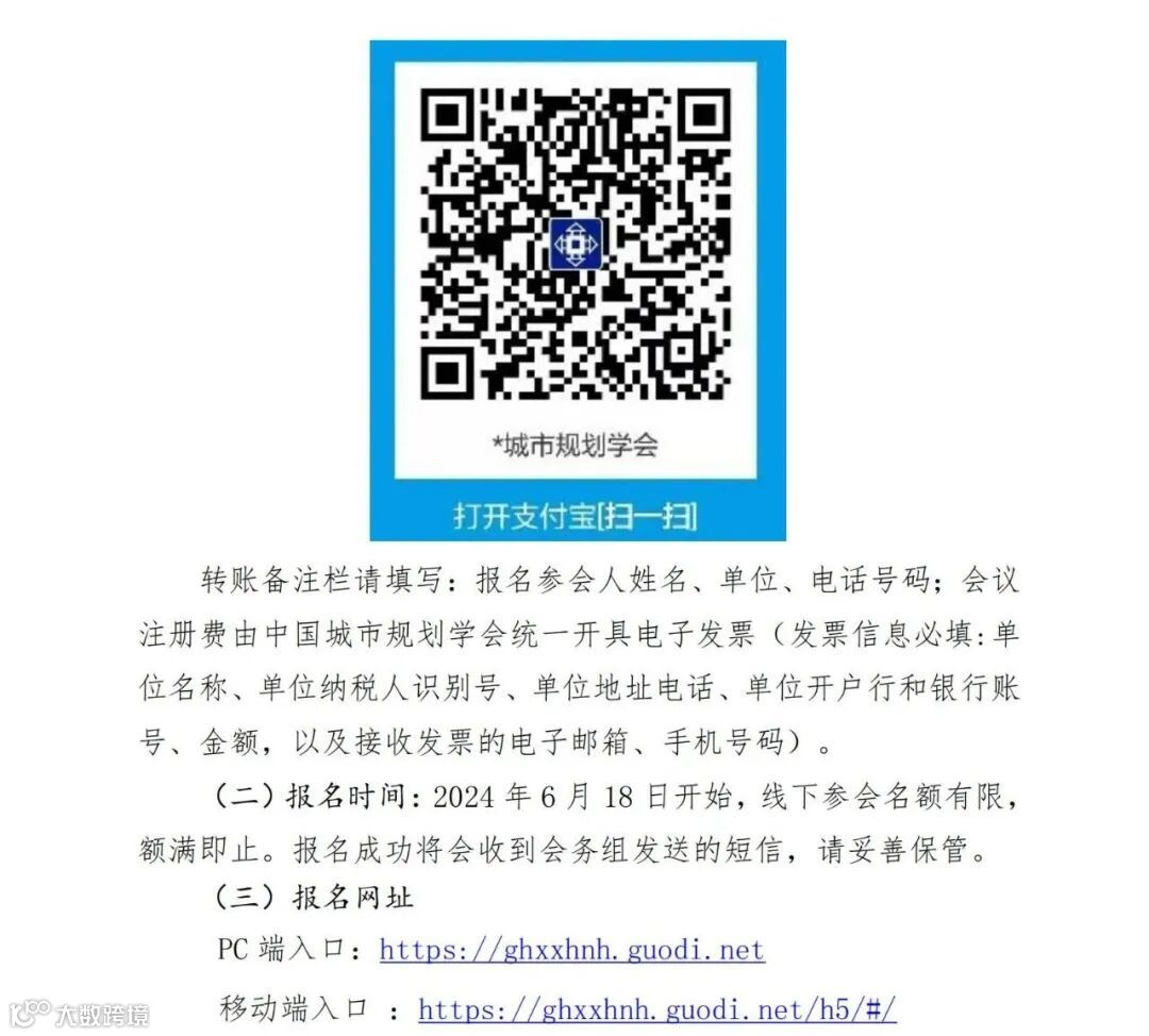 转账备注栏请填写:报名参会人姓名、单位、电话号码;会议注册费由中国城市规划学会统一开具电子发票(发票信息必填:单位名称、单位纳税人识别号、单位地址电话、单位开户行和银行账号、金额,以及接收发票的电子邮箱、手机号码)。