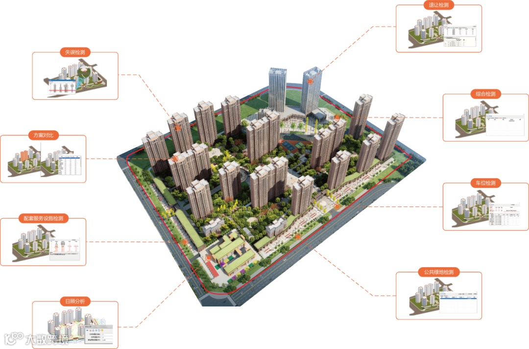 基于智能化审查引擎,开发失误检测、建筑间距检测、退让检测、综合检测等定量检测功能,综合形成总平面和建筑单体技术指标审查结果,审查要点与知识图谱实现关联解析。