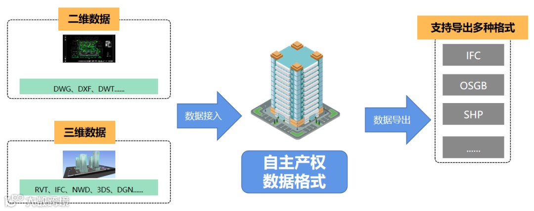 在各类规划报建成果中,由于设计标准与交付标准不一,往往存在数据格式不一致的情况。为了满足数据交换、共享以及自主可控的需求,基于IFC国际标准,开发具有自主知识产权的BIM数据格式作为平台标准交换格式。一方面兼容主流建模软件(包括AutoCAD、Revit、Bentley、CATIA等)的数据格式,并与通用数据格式间可互相转换;另一方面,满足规划、施工、竣工、不动产登记、运维等全生命周期之间的交互与正向传递。