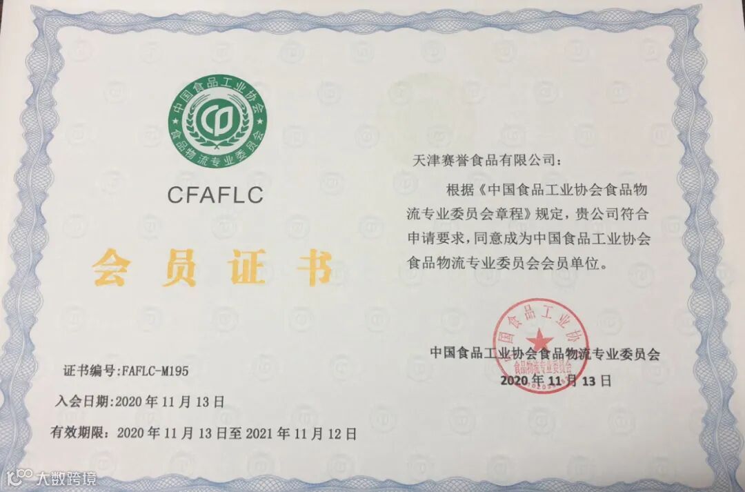 2020年11月被吸收为中国食品工业协会食品物流专委会会员