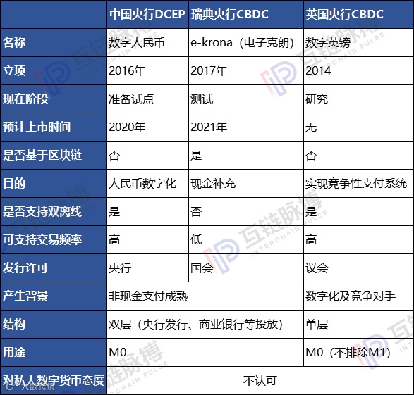 先来看一个中国、瑞典、英国央行数字货币对比表: