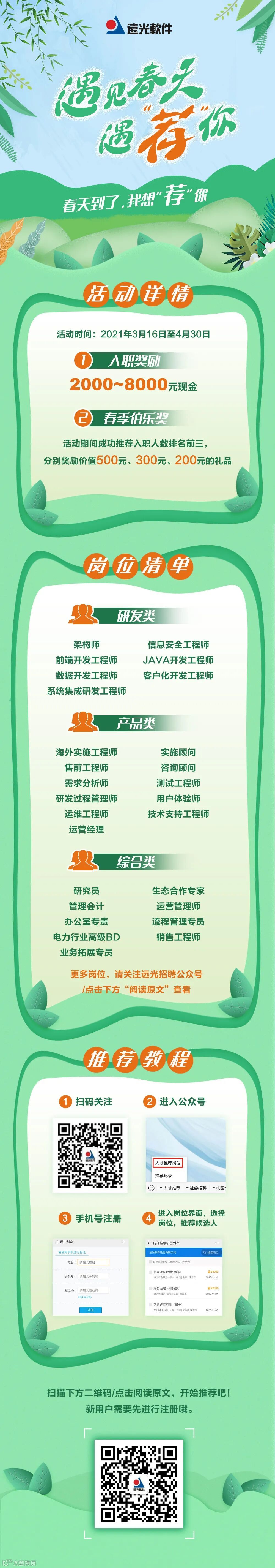 导读:远光春季人才推荐活动火热开启!推荐成功入职可获2000~8000元入职奖励!春季活动期间累计推荐入职数排名前三的伯乐还会获得额外礼品哦!你还在等什么,快推荐人才吧!