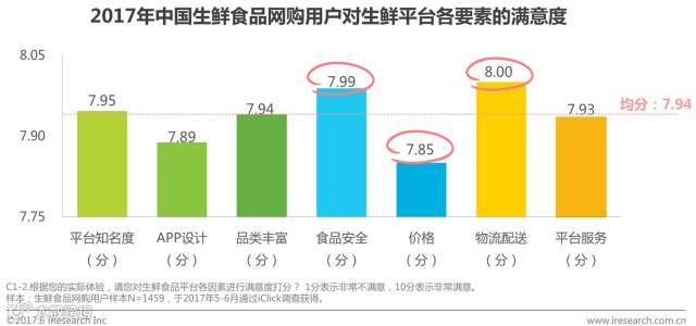 艾瑞调研数据显示,消费者网购生鲜食品最关注食品安全,在满意度评价中对食品安全的满意度相对较高,总体评分7.99仅次于物流的8.00。艾瑞分析认为,生鲜食品具有即时的特点,缩短配送时间,满足消费者的即时需求是各大生鲜平台的基本设计之一,目前很多平台可以实现次日达、当日达、两小时达,甚至30分钟达,物流的及时性以及冷链配送对新鲜度的保证共同推动了用户对物流和食品安全的高满意度。