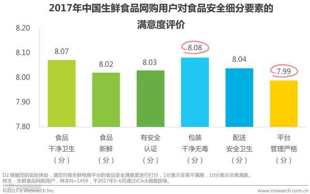 艾瑞将影响网购生鲜食品安全的要素分为以下指标:食品干净卫生、食品新鲜、有绿色安全认证、包装干净无毒、配送安全卫生、平台管理严格。其中,用户对包装满意度最高,评分平均为8.08,对平台的管理最不放心,评分最低,为7.99分。其余评分从高到低依次为食品干净卫生,8.07分;配送安全卫生,8.04分;有绿色安全认证,8.03分;食品新鲜,8.02分。