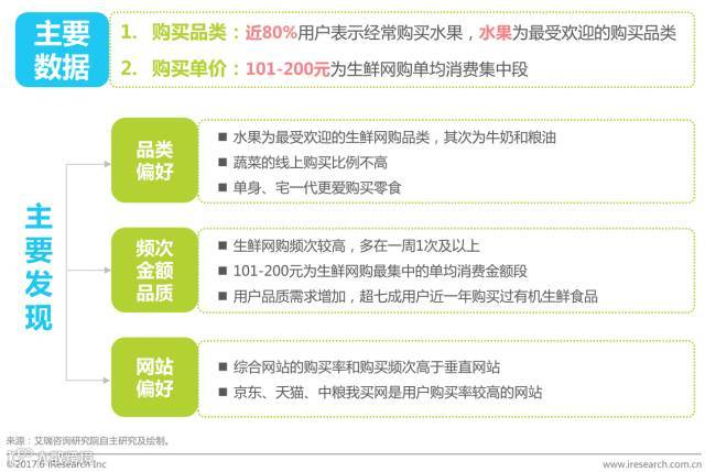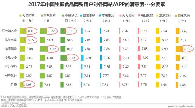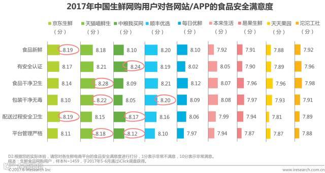 艾瑞调研数据显示,从细分品类和指标来看,生鲜食品平台各有优势。京东生鲜、天猫喵鲜生和中粮我买网的平台知名度较高,评分都在8分以上;从消费者最关注的食品安全要素来看,中粮我买网的满意度最高,为8.19分。