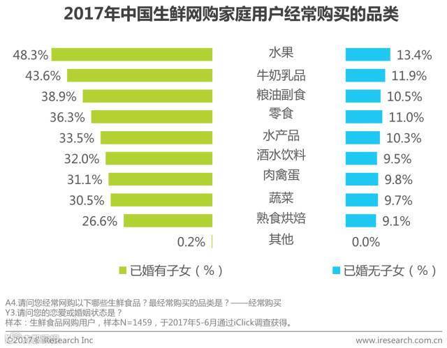 艾瑞调研数据显示,水果和牛奶为家庭用户最常购买品类。整体上看,有子女的家庭在各生鲜品来的购买比例均高于无子女家庭。此外,已婚家庭中,无子女家庭购买零食更多,有子女家庭则更关注自家厨房,更爱购买粮油副食等正餐食材原料。