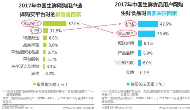 艾瑞调研数据显示,线上食品消费者最看重食品安全,在购买时却更多关注价格。在生鲜网购用户选购商品最看重因素中,食品安全以57.0%的比例位列第一,价格为第二看重因素;而在影响决策的因素中,价格却成为首要的关注要素,关注比例为42.6%,食品安全为第二关注要素,比例为36.4%。用户最看重食品安全,但在决策时受价格等影响更多。艾瑞分析认为,由于生鲜品类众多,且同一品类下的产品由于品牌、产地等不同,差异较大,但用户在购买过程中并不能有效区分不同产品的差异,所以在购买决策时会选择参考更直白的价格因素。