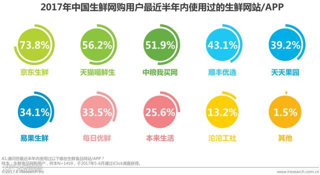 艾瑞调研数据显示,用户最近半年内使用过的生鲜电商网站中综合网站使用率高于垂直网站。其中,京东生鲜使用率最高,为73.8%,天猫喵鲜生56.2%,中粮我买网在垂直网站中的使用率最高,为51.9%。