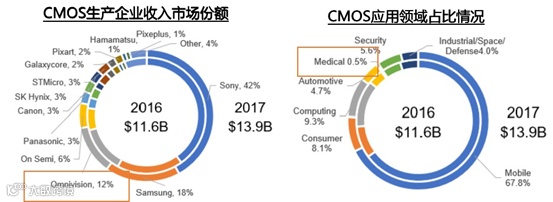 CMOS目前多应用于移动设备、照相机领域,医疗占比小但有快速增长趋势。代表厂商豪威(Omnivision)市占率约12%,于2016年被国内企业收购,加速国产厂商光学成像技术的迭代。豪威深耕医疗市场多年,为内窥镜厂商提供包括图像传感器、带线模组、ISP板和完整的参考设计方案等一系列解决方案。
