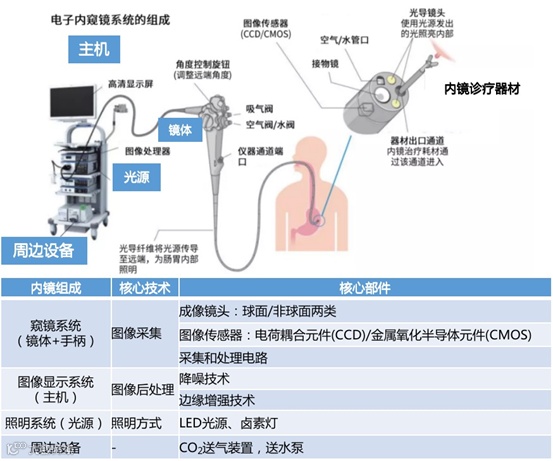内窥镜是集中了传统光学、人体工程学、精密机械、现代电子、数学、软件等于一体的检测仪器,由窥镜系统、图像显示系统、照明系统、周边设备组成,具有图像传感器、光学镜头、光源照明、机械装置等核心部件。