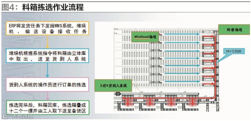 Miniload货架区产品主要作为单件的拣选出库。产品在车间被自动放到周转箱内并由箱式输送线送至库前,Miniload堆垛机同时插取两箱入库存储。当系统下发拣选任务时,Miniload堆垛机插取对应周转箱出库,输送至货到人拣选系统进行多订单的拣选任务。拣选后的订单箱叠成12个一摞,工人利用助力设备将成摞订单箱送至备货区暂存,拣选箱由输送线送回库。