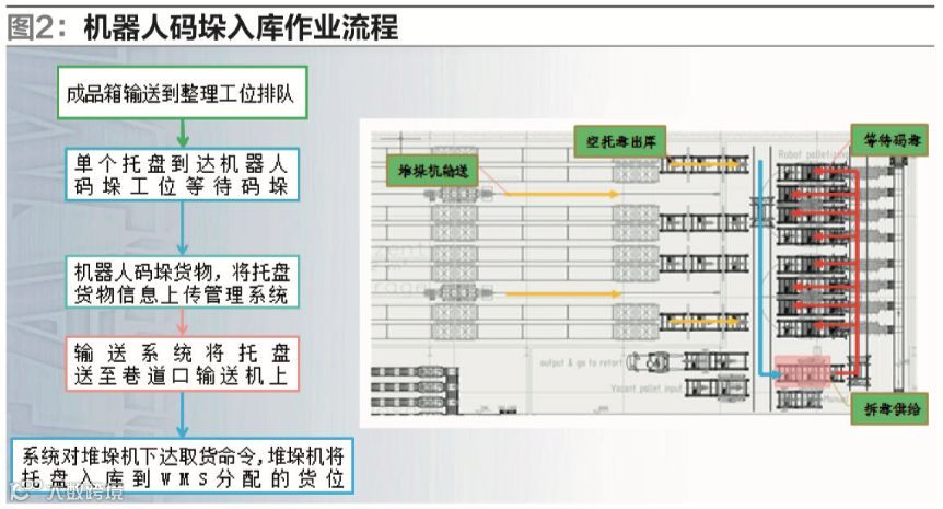 成品在车间装箱后,在线上自动喷码并由输送线送至码垛机器人前端进行码盘。码垛完成的托盘经过冷库过渡间到达立体库前,由托盘堆垛机送至库内货位存储。整托盘出库时,由托盘堆垛机从货位取出,经输送系统送至出库口,叉车工根据LED显示屏提示,将托盘货物放到对应备货区。