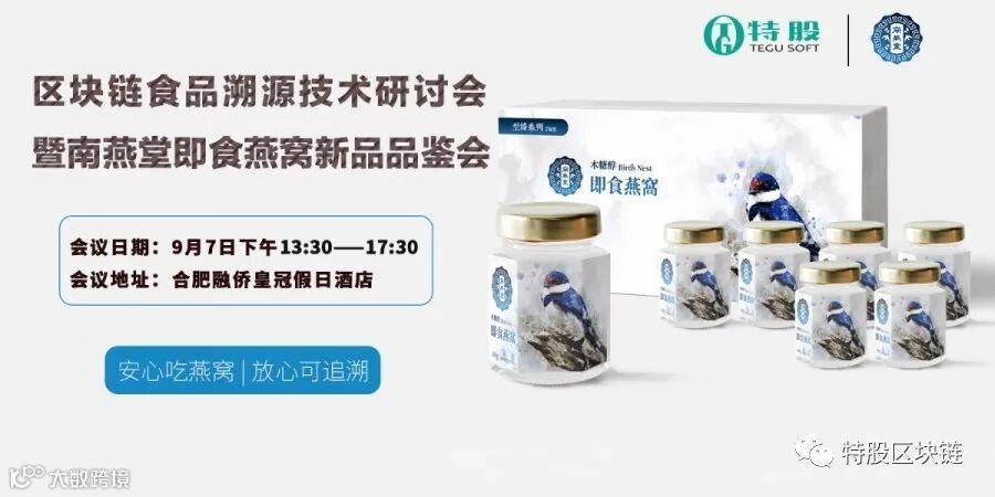 2019区块链食品溯源技术研讨会暨南燕堂即食燕窝新品品鉴会将于9月7日于合肥融侨皇冠假日酒店三楼宴会厅举行,届时邀请社会各界关注食品安全的有识之士共同参与见证,溯源见证品质,通证创造价值。如果说先进的区块链溯源技术部作为发展的开路虎,帮助南燕堂解决食品的信任问题。而传统的工艺沉淀与优秀的燕窝原料、轻便的即食包装就相当于如虎添翼塑造南燕堂的品质。未来,南燕堂将会利用区块链技术为食品安全打造一片天地,敬请期待!