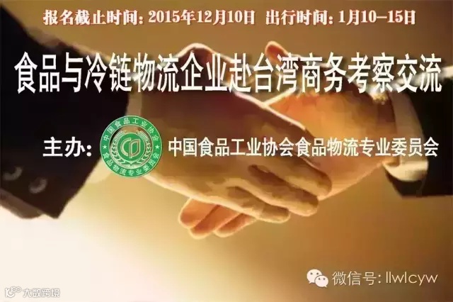 为促进大陆食品与冷链物流企业和台湾企业间的深入交流合作,中国食品工业协会食品物流专业委员会决定组织国内的食品与冷链物流企业相关负责人于2016年1月10日赴台湾进行为期6天的商务考察交流活动。希望通过此次考察可以让大陆的食品与冷链物流企业开拓视野,以此为契机扩大在这一领域的发展与合作。我协会也根据多年交流考察的经验和资源,为大家搭建一个大陆与台湾食品冷链物流企业、协会、政府交流洽谈、考察合作的平台,望相关企业积极踊跃报名参加。