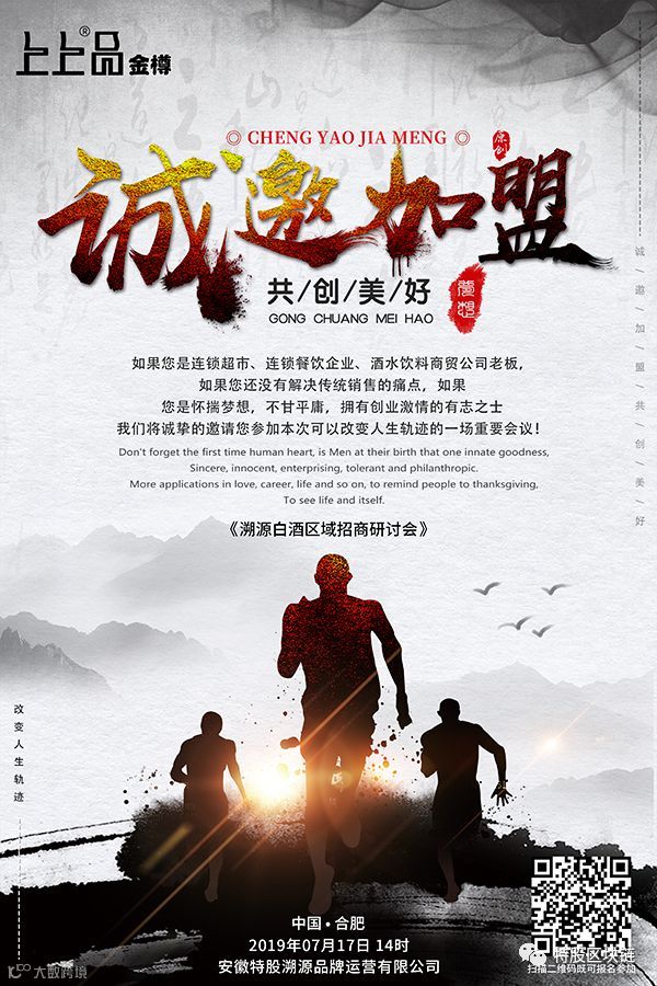 安徽特股溯源品牌有限公司举办的《溯源白酒区域招商研讨会》即将召开!我们能带给你什么?带给你实现创业梦想的金点子,带给你一款新品零到六千万的奇迹接力,带给你开启财富之门的金钥匙!如果你有雄图计划却没有合适的媒介推广,如果你不甘平庸却找不到方向,如果你不再想碌碌无为凭借自己的一臂之力却无法施展手脚。加入我们!方向,团队,助力,我们都有,梦想起航,财富之战!