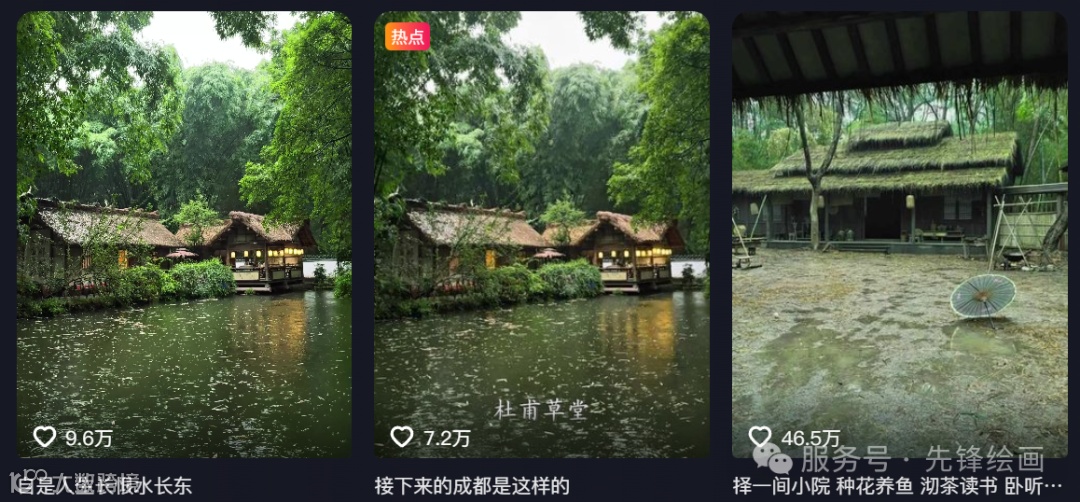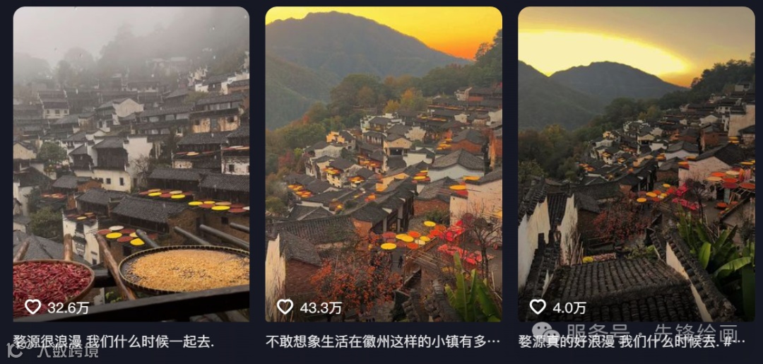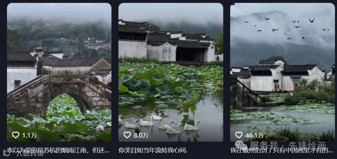 《呈坎烟雨》这类作品本月很多作者都做爆了。最高做到了46.1万点赞,同学们到抖音搜索:“我在徽州拍到了只有中国画才有的景色.” 标题就可以看到大量这样的作品。