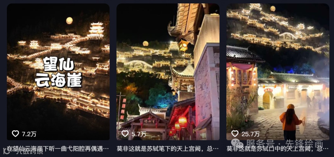 《望仙谷夜景》这类作品本月很多作者都做爆了。最高做到了25.7万点赞,同学们到抖音搜索:“莫非这就是苏轼笔下的天上宫阙. ” 标题就可以看到大量这样的作品。