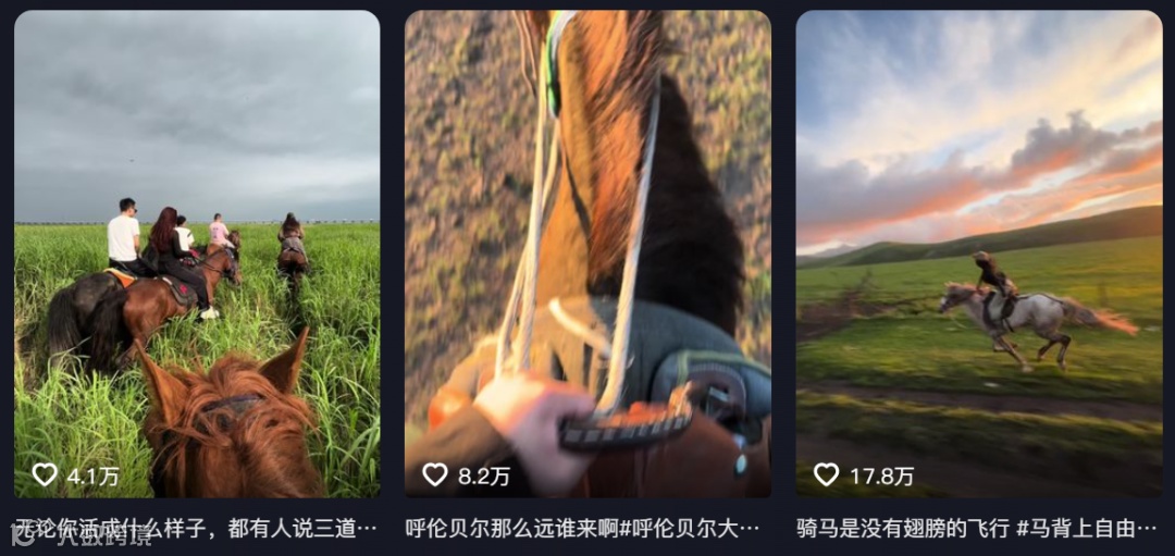 《草原骑马》这类作品本月很多作者都做爆了。最高做到了17.8万点赞,同学们到抖音搜索:“呼伦贝尔那么远谁来啊” 标题就可以看到大量这样的作品。