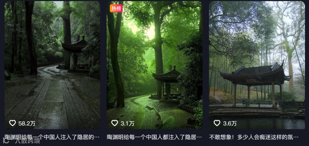 《云溪竹径》这类作品本月很多作者都做爆了。最高做到了58.2万点赞,同学们到抖音搜索:“陶渊明给每个中国人注入了隐居年头” 标题就可以看到大量这样的作品。