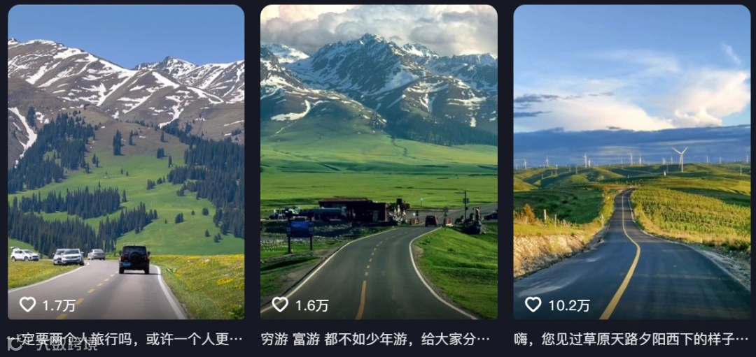 《草原公路》这类作品本月很多作者都做爆了。最高做到了10.2万点赞,同学们到抖音搜索:“草原公路” 标题就可以看到大量这样的作品。