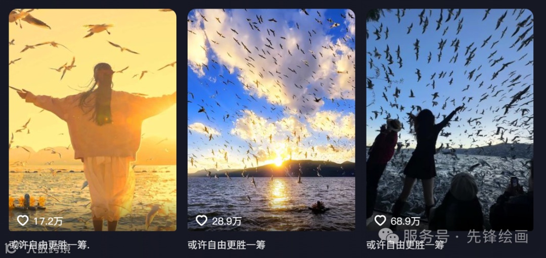 《海鸥》这类作品本月很多作者都做爆了。最高做到了68.9万点赞,同学们到抖音搜索:“或许自由更胜一筹” 标题就可以看到大量这样的作品。