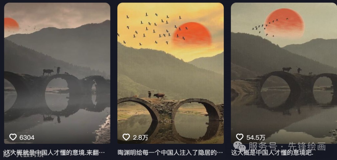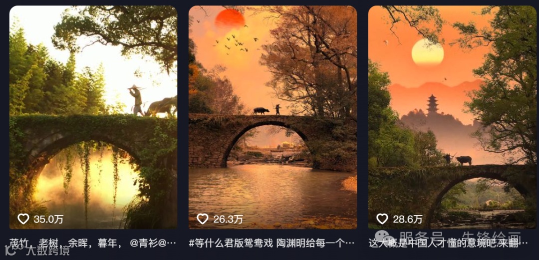 《桥上放牛》这类作品本月很多作者都做爆了。最高做到了35万点赞,同学们到抖音搜索:“这大概是中国人才懂的意境吧” 标题就可以看到大量这样的作品。
