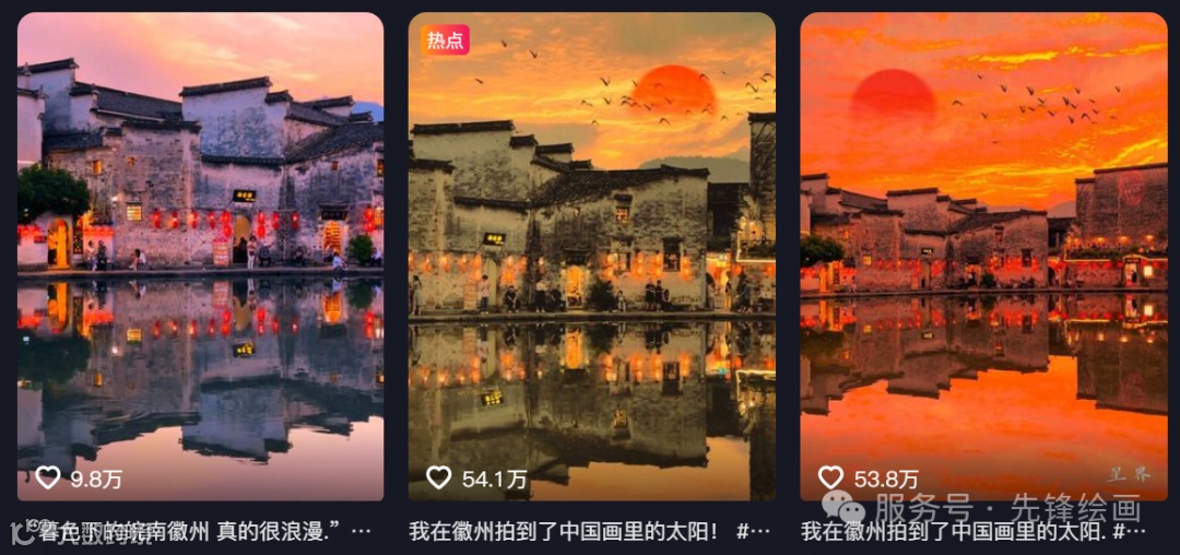 《徽派夕阳》这类作品本月很多作者都做爆了。最高做到了54.1万点赞,同学们到抖音搜索:“我在徽州拍到了中国画里的太阳” 标题就可以看到大量这样的作品。
