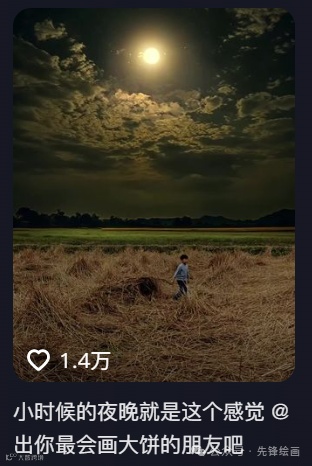 02.《月下稻田》这类作品本周很多作者都做爆了。最高做到了1.4万点赞,同学们到抖音搜索:“小时候的夜晚就是这个感觉 @出你最会画大饼的朋友吧 ”标题就可以看到大量这样的作品。