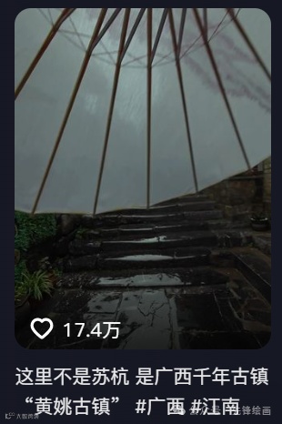 03.《古镇混剪》这类作品本月很多作者都做爆了。最高做到了17.4万点赞,同学们到抖音搜索:“这里不是苏杭 是广西千年古镇“黄姚古镇” #广西 #江南” 标题就可以看到大量这样的作品。